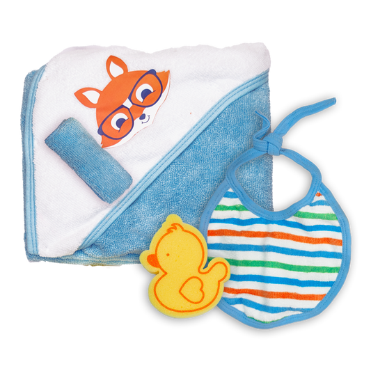 SET DE BAÑO; TOALLA, FACIAL,BABERO Y ESPONJA EN BOLSA TULL. AZUL E-220094 NO APLICA DESC